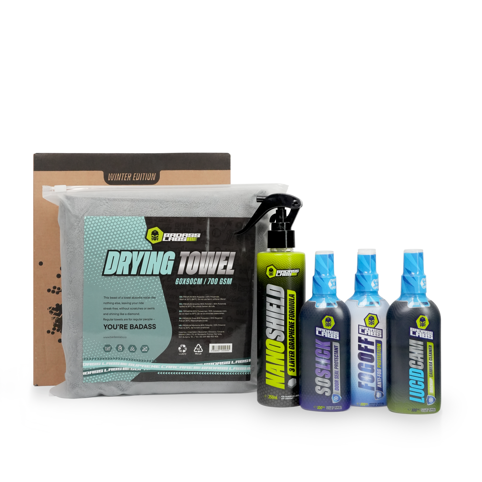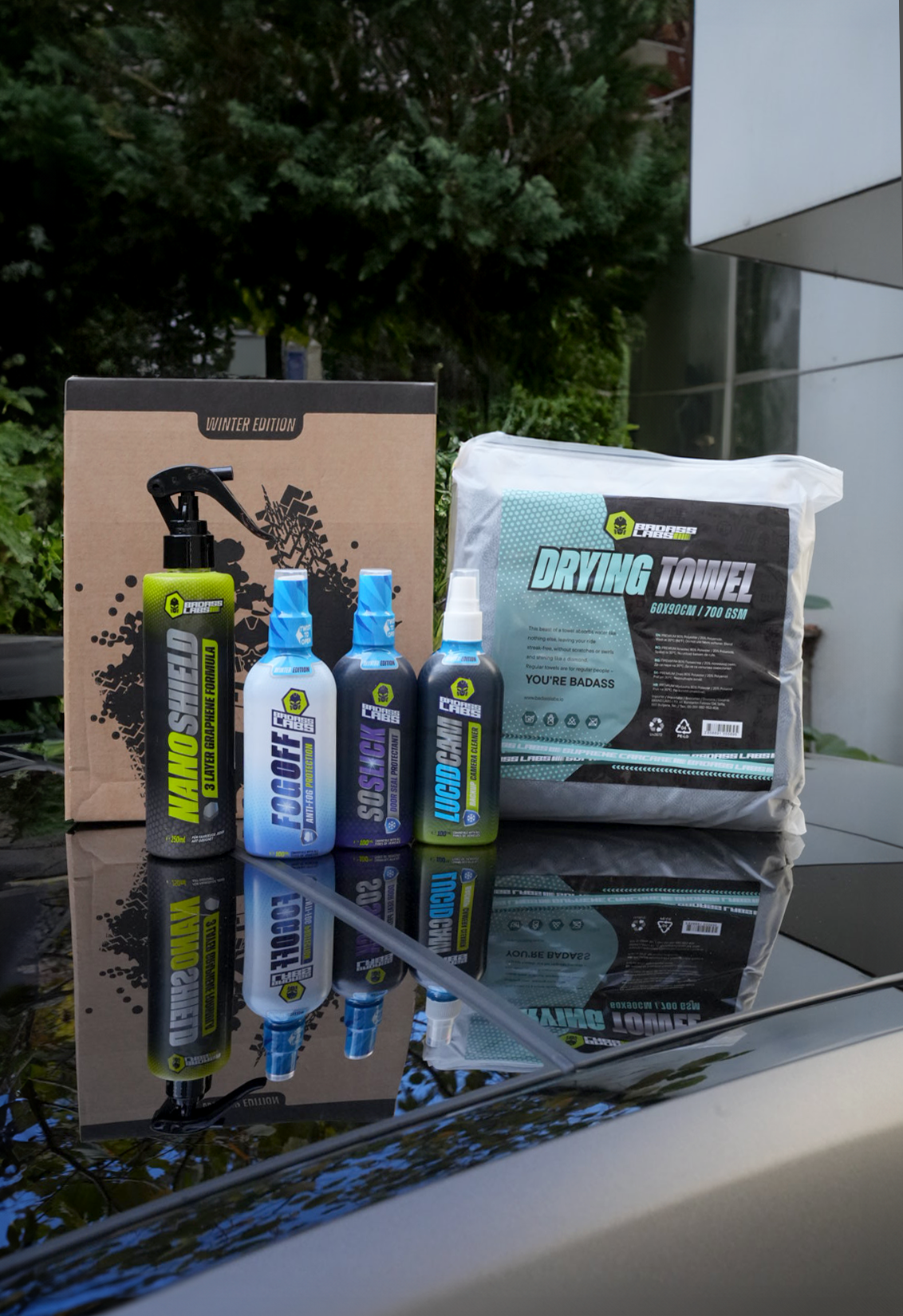 NanoShield – 3-слойна защита с графен, керамика и силиконов емулгатор. Създава хидрофобен щит срещу сол, кал и пясък, запазвайки боята блестяща и защитена. DryingTowel – Ултраабсорбираща микрофибърна кърпа, която подсушава без следи, влакна или петна. Идеална за финален детайл след всяко измиване. LucidCam – Спрей за почистване и защита на камерите за паркиране. Осигурява ясно изображение дори в мъгла, сняг или дъжд. SoSlick – Професионален спрей за защита на гумените уплътнения. Предпазва от замръзване и залепване на вратите. FogOff – Анти-конденз спрей за стъкла и огледала. Гарантира кристална видимост отвътре при всякакви условия.